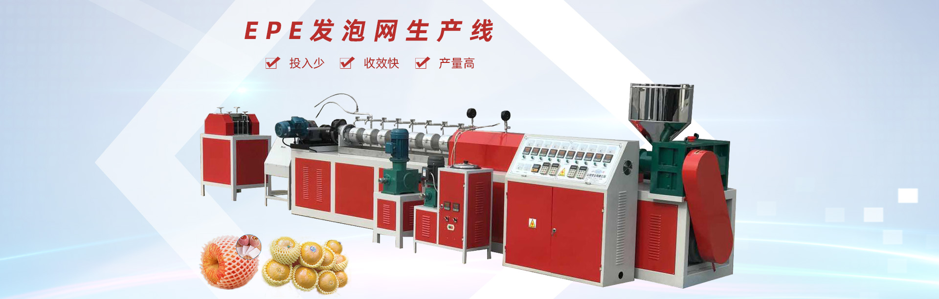 龍口市山河塑業(yè)有限公司生產(chǎn)的發(fā)泡網(wǎng)套機(jī),用于水果、蔬菜、花蕾及瓶類的外包裝。我公司具有多年的實(shí)踐經(jīng)驗(yàn)和可靠的技術(shù)力量,根據(jù)市場需求開發(fā)各種規(guī)格的網(wǎng)套。每24小時生產(chǎn)蘋果網(wǎng)套80萬-120萬個,設(shè)備驅(qū)動電機(jī)采用變頻控制,調(diào)速精度高、范圍廣、能耗低、運(yùn)行可靠每小時僅用電10度左右,產(chǎn)量提高。此外,該生產(chǎn)線配置不同的模頭和輔機(jī)可生產(chǎn)發(fā)泡片、發(fā)泡管、發(fā)泡棒、發(fā)泡條及異型材等產(chǎn)品。